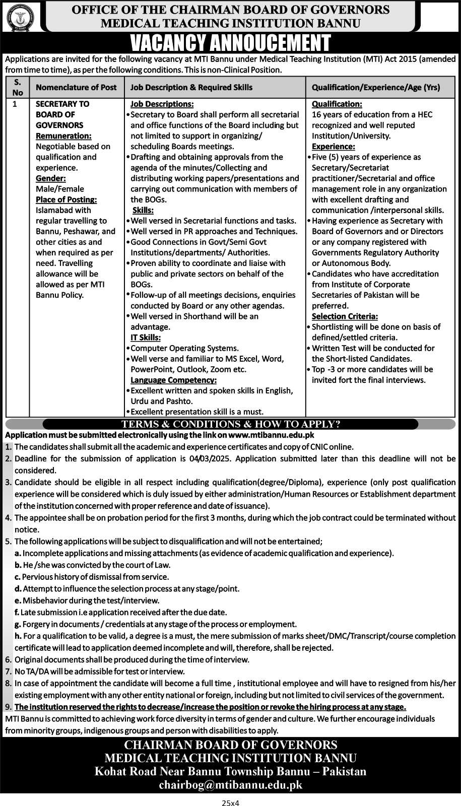 Position Vacant for Secretary to Board of Governers in MTI Bannu advertised on 25/02/2025